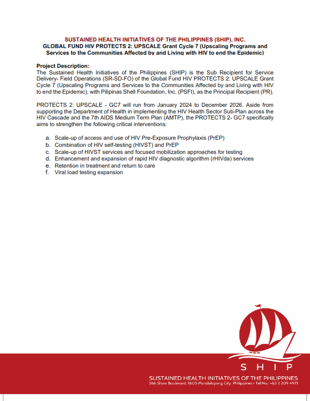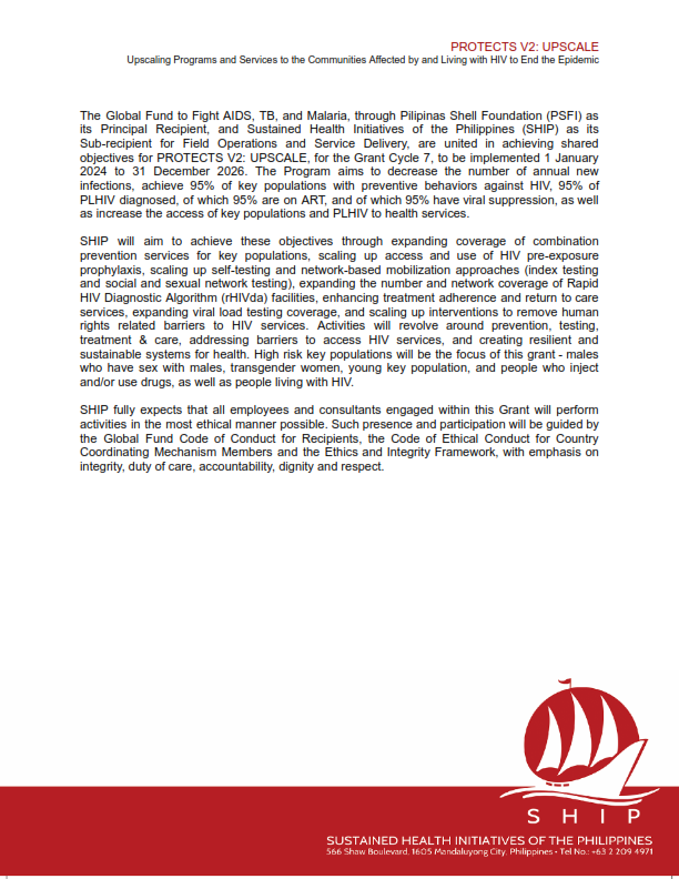 The Global Fund to Fight AIDS, TB, and Malaria, through Pilipinas Shell Foundation (PSFI) as its Principal Recipient, and Sustained Health Initiatives of the Philippines (SHIP) as its Sub-recipient for Field Operations and Service Delivery, are united in achieving shared objectives for PROTECTS V2: UPSCALE. Activities for PROTECTS V2: UPSCALE will revolve around prevention, testing, treatment & care, addressing barriers to access HIV services, and creating resilient and sustainable systems for health, with high risk key populations as the focus of this grant.